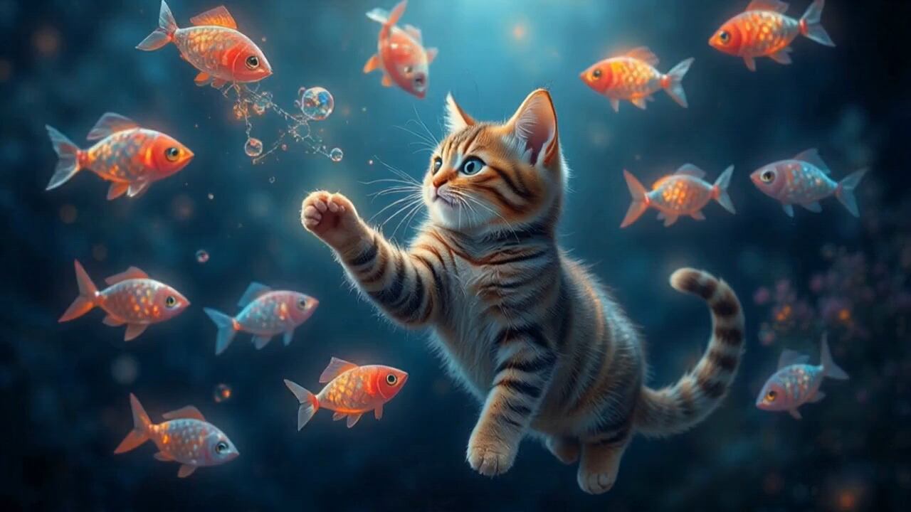 驚きの可愛さが詰まった、魅惑のAI動画素材「お魚とたわむれるニャンコ」